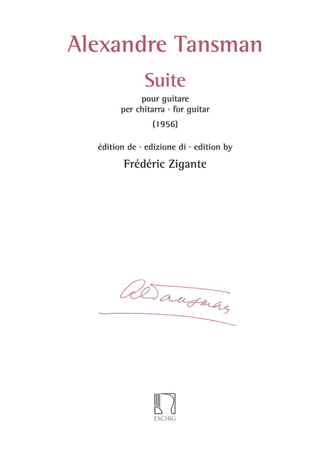In 1956, Alexandre Tansman presented the guitarist Andrés Segovia with this suite in six movements conceived like a musical portrait of the Spanish guitarist. Segovia was not fully satisfied with the outcome of all six pieces and reduced the suite to just three movements, later published between 1962 and 1964 by Éditions Max Eschig under the title Trois Pièces pour guitare. Starting from the text established in the 2nd volume of the critical edition of Tansman's works for guitar by Frédéric Zigante (Œuvres pour guitare – Suites, DF 16637), this edition restores the complete suite, with the addition of fingerings by Andrea De Vitis.