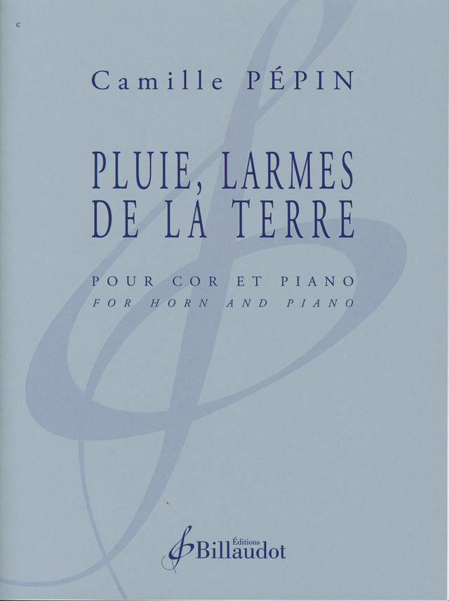 Pluie, larmes de la Terre (Rain, Earth's Tears) is a piece for horn and piano. White we all feel the strain oj the current pandemic-related forced isolation, the crisis also prompts us ta refocus on essentials. My own need ta reconnect with Nature was stronger than ever and I realized with even greater intensity that our relationship with Nature was invaluable. As I started working on this piece, I was deeply concerned with the impact of climate change. The horn is - symbolically - associated with magical powers. The piano evokes the sound of water, the music of Debussy ... I had the feeling that protecting nature from human-induced destruction could do with a little magic twist. Combining the two instruments gave me an opportunity ta explore new sounds that would enable me ta express my fears.