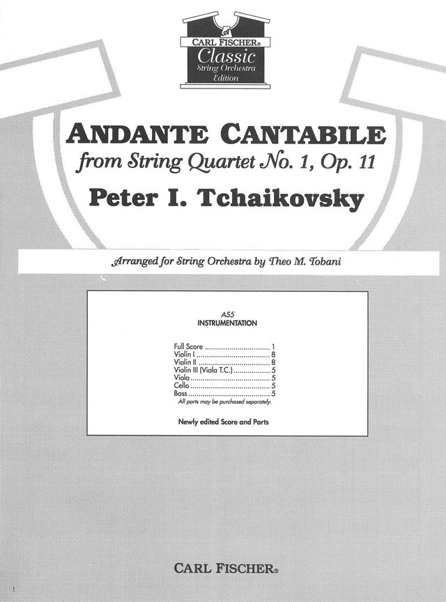 Theo Tobani's celebrated arrangement of the ever-popular Andante Cantabile, has been restored to the catalog in an edited and corrected edition. This wonderful piece, full of Tchaikovsky's trademark warmth and tenderness, is a string repertoire favorite and this edition (which includes an alternate 3rd Violin part, which can be used instead of Viola) makes the piece accessible to school string orchestras of any size and make-up.