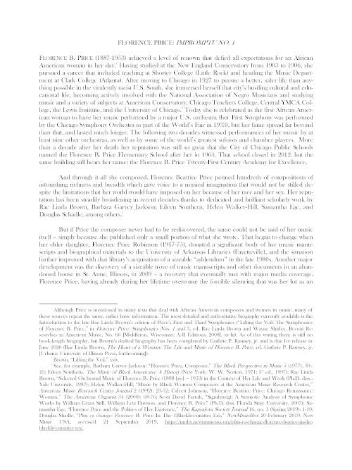 The manuscript of Impromptu No. 1 is undated, but on 25 June 1926 Price submitted it for publication to the publisher Arthur P. Schmidt & Co., a Boston-based firm that had a strong commitment to publishing music by U.S. composers, including an unusually high (for the time) representation of music by women. The firm declined the opportunity, however, and notified Price of this decision on 6 November 1926. The work dates from relatively early in Price's composing career and reveals little of the genius for integrating conventional White styles and Black vernacular idioms that characterizes much of her later music, but it is still the work of a mature composer. By designating it an impromptu, she gave it the genre's usual connotation of brief, unstudied spontaneity. Yet two signature facets of her later style are already clearly visible: her talent for writing material in clearly delineated sections that contrast strongly but are unified by a subtle but distinct musical gesture; and her surefire dramatic pacing. The former is evident in the chromatic chains that are immediately obvious in the A sections (mm. 1-32 and 75-89) but appear only gradually in the B section, and the latter is evident in the coda (mm. 90ff.), which begins with two bars of an augmented sonority and becomes increasingly agitated as it leads to the tempestuous close.