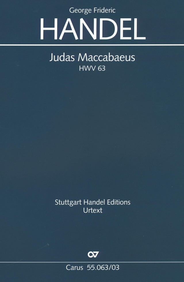First critical edition. The oratorio Judas Maccabaeus is one of George Frideric Handel's most popular choral works. It was performed over fifty times during the composer's lifetime and was one of his first works to be performed in Germany (1772). The frequent performances given by Handel himself resulted in a particularly large number of reworkings, reflecting local conditions. This new edition therefore offers the work in two performable versions: firstly, the version of the first performance in 1747, and the one from the last oratorio season during Handel's lifetime (1758, No. 59). This makes available all the choruses and arias which Handel ever wrote for Judas Maccabaeus. Reflecting the latest Handel research, the edition is based for the first time throughout on Handel's conductor's score, thereby eradicating not only long-perpetuated mistakes, but also providing clarity about which pieces were actually performed by Handel. By contrast with the Chrysander edition obligatory until now, the aria "Father of heav'n" which introduces Part III is included here in its original, longer version.