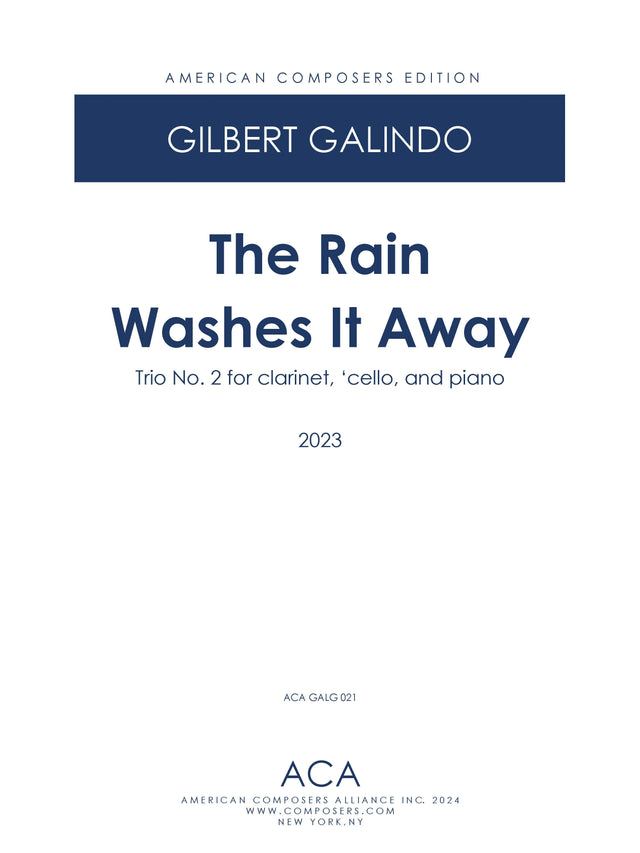 The music itself includes nostalgic sentiments, playful and rough gestures, atmospheric soundscapes, and melodic expiation and exaltation. "The Rain Washes It Away" for clarinet, ‘cello, and piano was written for and commissioned by Random Access Music and Artistic Director Thomas Piercy with support from the New York State Council on the Arts.