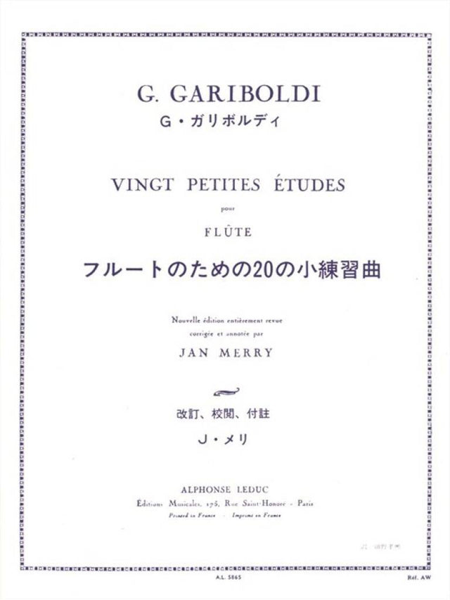 "Italian flautist and composer, Giuseppe Gariboldi (1833-1905) moved to Paris after his studies where he worked as a virtuoso Flute player and prolific composer. Being exceedingly talented, Gariboldi's compositions range from operettas to studies, including his ever-popular teaching aid, Vingt Petites Études for Flute. Covering a huge spectrum of Flute techniques, studies in Vingt Petites Études address articulation, dynamics, note values, single and double tonguing, breath control, range, vibrato and ornamentation, among other things. Giuseppe Gariboldi's Vingt Petites Études is essential to accompany all flautist's progress."