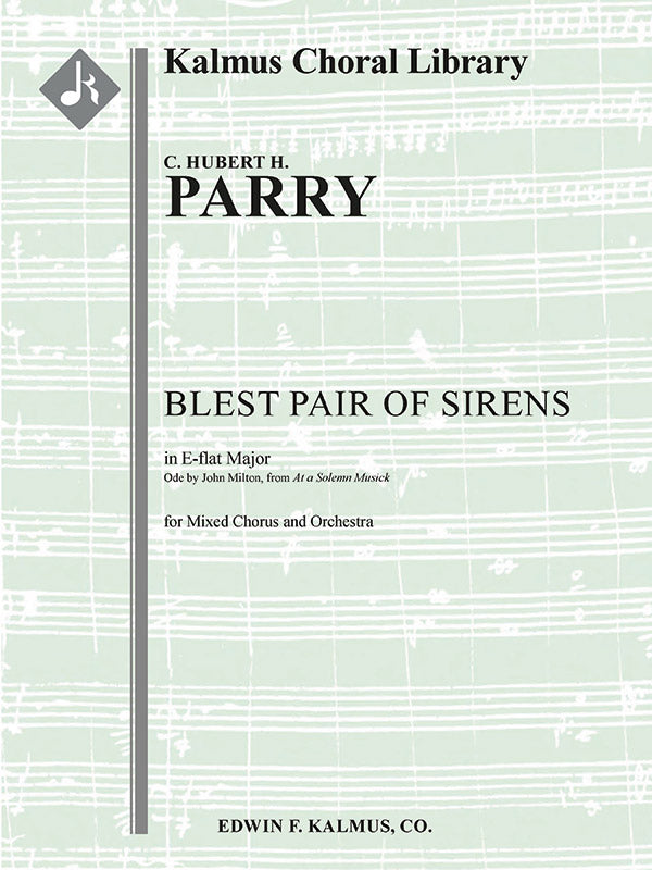 Best known as the composer of the anthem JERUSALEM, Charles Hubert Hastings Parry (1848-1918), wrote a number of songs for choir and orchestra. One of these, BLEST PAIR OF SIRENS (AT A SOLEMN MUSIC), came about as the result of a commission by contemporary composer Charles Stanford for a concert celebrating the Golden Jubilee of Queen Victoria. Performed on May 17th, 1887 at St. James's Hall in London, Stanford conducting, it quickly achieved acclaim and has been performed at such events as the Last Night of the Proms and the wedding of Prince William and Catherine Middleton. Instrumentation: 2.2.2.2+1: 4.3.3.1: Timp: Org: Str (9.8.7.6.5 in set): Mx Chor.