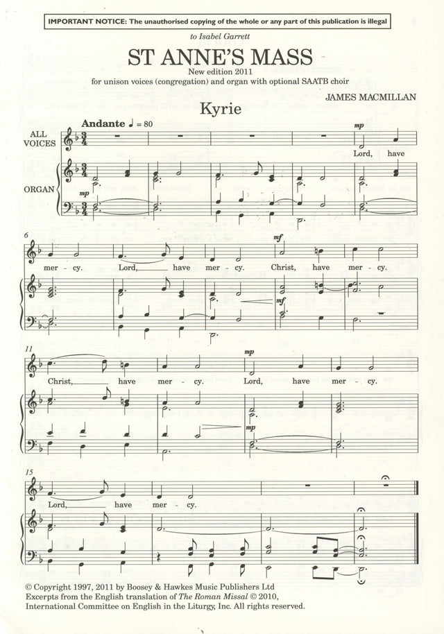 MacMillan's popular congregational mass setting updated with the text of the new English translation released in 2010. in A Major addition is the inclusion of a newly composed setting of the Gloria. Suitable for congregational use, with or without choir. All ability levels.