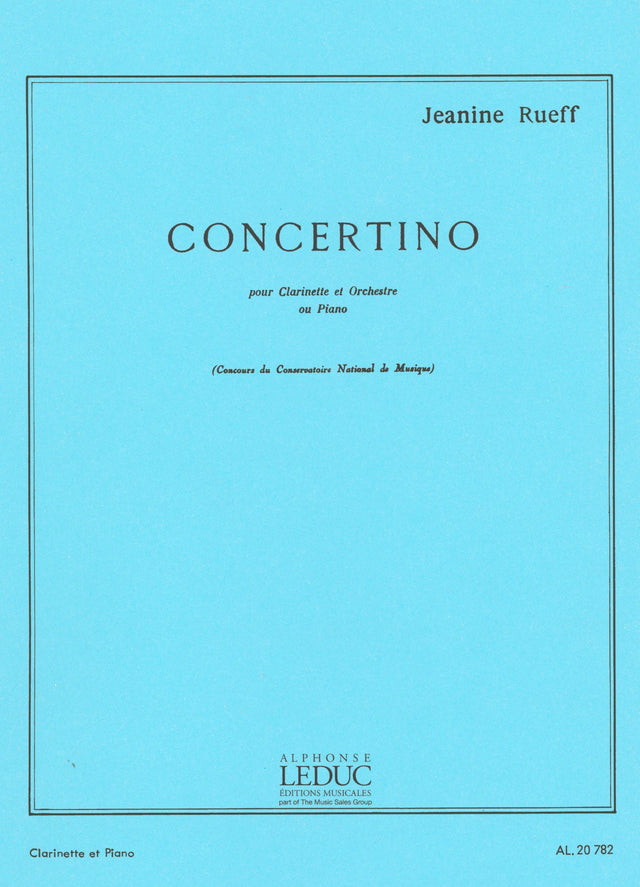 "Jeanine Rueff (1922-1999) was a French composer and music educator. Her Concertino for Clarinet and orchestral or Piano accompaniment was first published in 1950 and remains a popular, alternative piece in the advanced clarinetist's performance repertoire. Rueff wrote extensively for the Saxophone and Clarinet and her compositions are often used as required contest solos. Concertino is fast and contains complex rhythms. Other appealing musical features include chromaticism, triplet motifs and the exploitation of the entire range of the Clarinet. Rueff's Concertino provides a challenging yet riveting piece for advanced clarinetists."