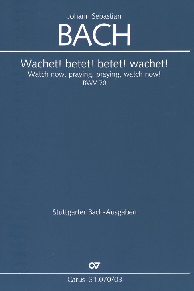 First performed on the 26th Sunday after Trinity in 1723, Wachet! betet! betet! wachet! (Watch! Pray! Pray! Watch!), BWV 70.2 is in two-parts. The cantata's first part is heard before the sermon and the second after. This form is due to the work's history. Originally composed for the second Advent Sunday in 1716, the cantata was expanded from 6 to 11 movements with some textual additions to create recitatives and an additional chorale at the end of the first part. Since this was undertaken while retaining the original text, this edition can also be used for a performance of the Advent cantata BWV 70.1, of which only fragments have survived (movements 2, 4, 6, 7, and 9 are then omitted).