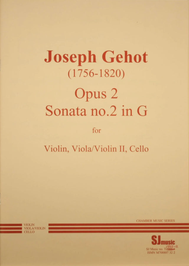This pleasant string trio is very straightforward (it does not go above third position for the violin), and is rhythmically a little more complex than Trio 1. It would be suitable for players of intermediate standard. It is the second of six trios in, Op. 2, and has three movements. A second violin part has been included, which can replace the viola part if no viola player is available. It was composed by Joseph Gehot who was born in Brussels in 1756, moved to the USA in 1792, and died there circa 1820. He was a violinist, composer and teacher and amongst his compositions were numerous string quartets, trios and duos. in 1991, "Musique en Wallonie" was set up in Belgium with the goal of discovering the rich musical heritage of the region and finding works of composers that had fallen into undeserved oblivion. Joseph Gehot is one of the composers who was selected.