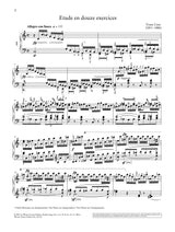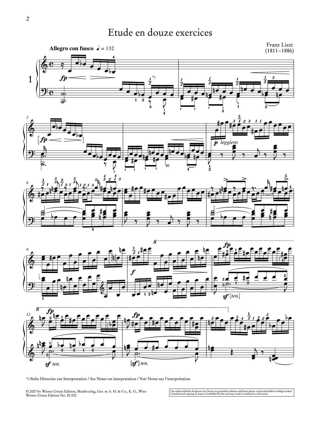 In 1826, 15-year-old Franz Liszt wrote his first cycle of studies which he actually wanted to be seen as a grand étude consisting of 12 different exercises, as an 'Etude en douze exercises'. Each of these exercises, however, is an independent study dealing with a certain technical problem. Although they became a model of Liszt's great études ('Grandes Etudes') later, these early works were still a far cry from the technical demands of their big siblings. They are all the more suited in advanced lessons as an excellent alternative to the more demanding studies of Czerny.