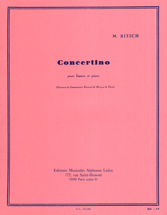 Born in Toulouse, Marcel Bitsch (1921-2011) went on to study at the Paris Conservatoire before becoming a professor of counterpoint at the institution. As an exceptionally versatile composer, Bitsch has composed orchestral works, chamber works and numerous pieces and studies for wind instruments. Concertino is a sublime addition to the Bassoon repertoire. Suited to advanced level bassoonists, Bitsch's Concertino contains a range of exciting musical aspects, including varied articulation, complex rhythms, irregular phrasing, exploited tonality and much variation in dynamics, tempo and performance directions. The diversity of musical elements included in this Marcel Bitsch Concertino for Bassoon and Piano is outstanding, creating a necessary addition to the advanced bassoonist's repertoire.