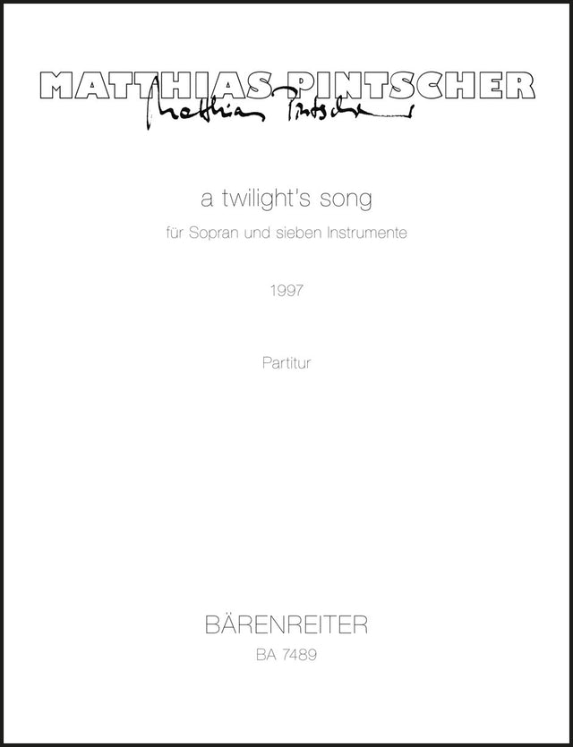 Written for soprano plus viola, cello, bass flute, bass clarinet, harp, piano, and drums.