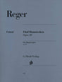 Reger's "Five Humoresques" follow in the footsteps of the nineteenth-century genre inaugurated by Robert Schumann's "Humoresque", Op. 20. Occasionally Reger gives vent to high-spirited good humor, as when he quotes a hit tune from his own day, "Du bist verrückt mein Kind" ("You're crazy, my child"). The piano writing is imaginative, brilliantly pianistic, and harmonically rich.