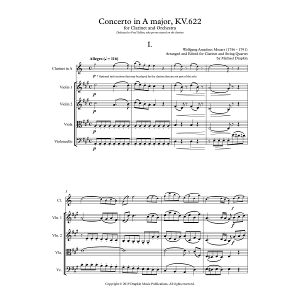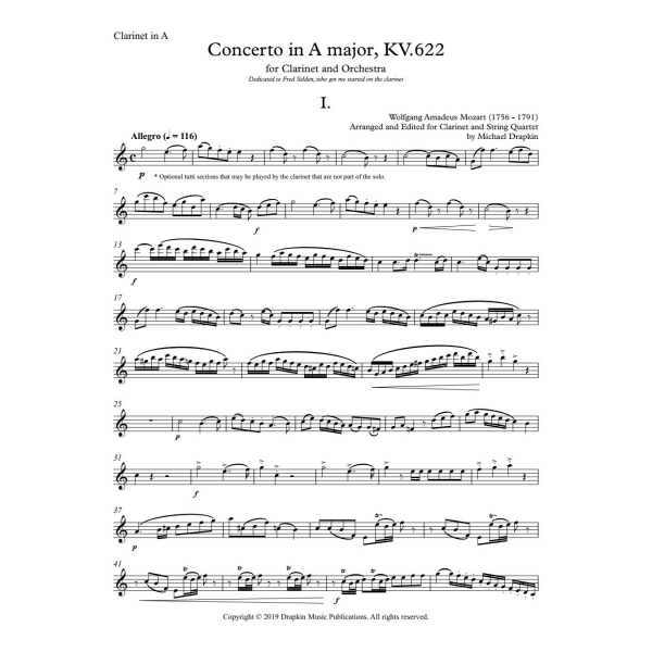 Long an orchestral clarinetist and soloist, Drapkin knows well thin in E Major repertoire for his instrument. The Mozart Concerto is de rigueur for advancing clarinetists, although few are fortunate enough to perform with full orchestra. Drapkin's arrangement with string quartet expands performance opportunities while remaining faithful to the original.