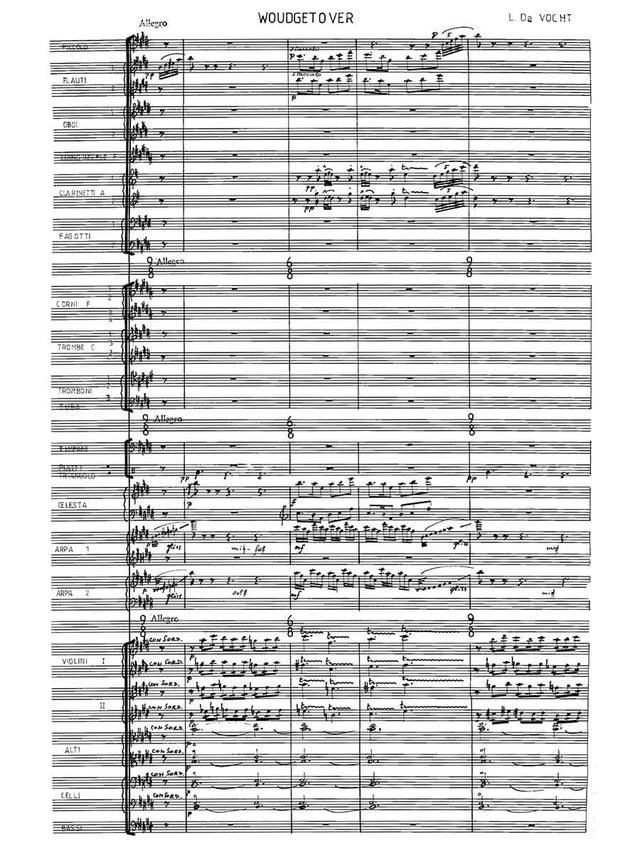 After Morgenstemming and Ontwaking, Woudgetover is the third orchestral work in which De Vocht aims to express his being enchanted by nature and its sounds. What is striking in this impressionistic work is the density of sound: truly all orchestral instruments, two harps and a celesta included, are engaged from beginning to end, albeit in nuances between pianissimo and mezzo-forte. At times, the volume gradually swells, only to fade back into soft, nuanced tones. While in the orchestra ‘everything that has life moves', the sounding result is curiously a sense of motionlessness. Consequently, there is no modulation in Woudgetover: E as tonic and B as dominant are throughout the piece the foundations on which everything is based.