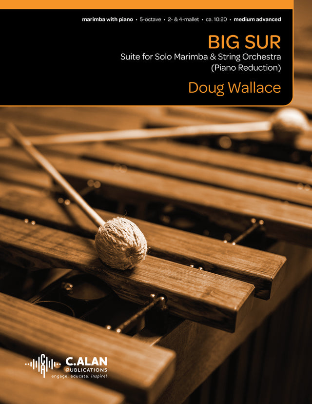 Big Sur: Suite for Marimba and String Orchestra is generally about the natural beauty of Big Sur, California, but also pays homage to three of the main performers who made the area famous for folk music with their performances at the 1969 Big Sur Folk Festival - Joan Baez, The Beach Boys, and Crosby, Stills, Nash and Young. It is set in three movements: Morning Fog, Coastal Redwoods, and Highway One.