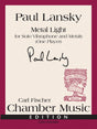 Commissioned by the Percussive Arts Society, this piece for one solo percussionist on vibraphone and metals is equally at home with vibrant, motoric, staccato passages as it is with feathery light whispers, notes blending together gently with the vibraphone pedal. The addition of metals, usually indeterminate or noisy in pitch, brightens and enriches the sound world of the vibraphone, making for a sophisticated palette. Like Lansky's other works for percussion, this piece will be a beloved addition to the advanced percussionist's repertoire.