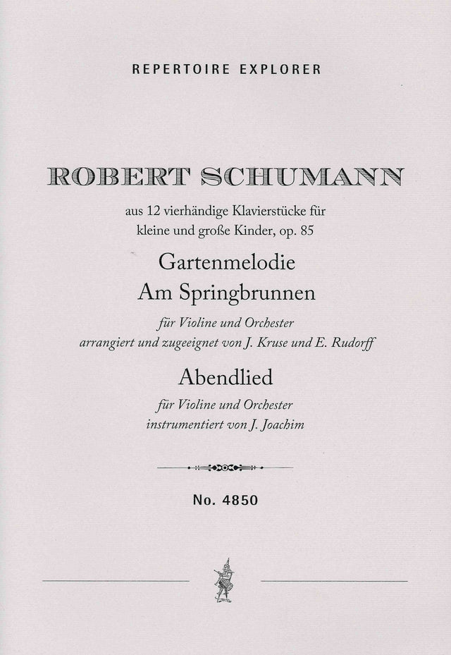 Garden Melody and At the Fountain, Two Pieces from Op. 85 For violin and orchestra, arranged and orchestrated by Johann Kruse and Ernst Rudorff Berlin: Bote & G. Bock, plate 13117. Orchestration (Gartenmelodie): solo violin with 2 clarinets (A), 2 bassoons, 2 horns (A), strings Orchestration (Am Springbrunnen): solo violin with 2 flutes, 2 oboes, 2 clarinets (B-flat), 2 bassoons, 2 horns, 2 trumpets (D), 2 timpani (D, A), strings