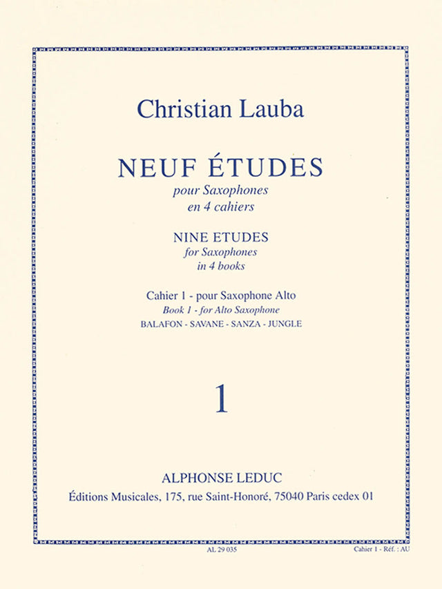 The first volume contains the first four studies; 1) Balafon, 2) Savane, 3) Sanza, and 4) Jungle. Nine Studies for Saxophones is very modern in style, exploiting extended techniques of the Saxophone to the maximum. These include multiphonic sounds, subtones, slap-tongue, harmonics, flutter tonguing, double tonguing, slaps and key noises. with modern classical music becoming more and more prominent within the genre, Lauba's Nine Studies for Saxophones is essential to all saxophonists.