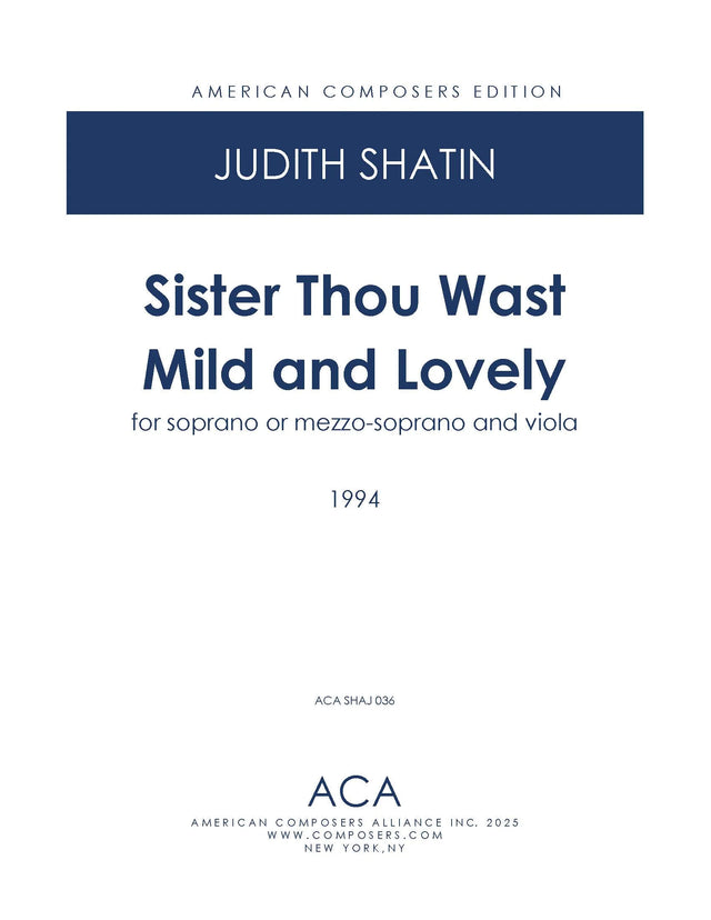 Sister Thou Wast Mild and Lovely is a setting of the lyrics of a Primitive Baptist hymn by Samuel Francis Smith that I composed in memory of my dear friend, violist Rosemary Glyde. I met Rosemary on my first day at the Aspen Music Festival and we became close friends immediately, with our friendship continuing while students at Juilliard and for the rest of her too-short life. We collaborated on numerous occasions, resulting in a number of pieces. Three of the high points were her performance of Arche for viola and orchestra, with the Houston Symphony, her premiere of Glyph (solo viola, string quartet and piano) at Merkin Hall and her performances of Doxa (viola & piano) and L'etude du Coeur (viola) on her Tully Hall debut. She was a champion of contemporary composers, including Richard Lane and Bernard Hoffer. A fine composer herself, she created Whydah (viola) and Weji, for viola quartet, as well as her transcriptions of the Rachmaninoff Cello Sonata and of J.S. Bach's Cello Suites for viola. I will always miss Rosemary's warm friendship, her adventuresome spirit and her consummate musicality.