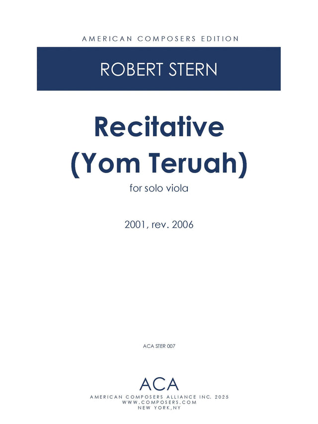 Robert Stern's Recitative (Yom Teruah) originated in 2001 at the request of cellist Matt Haimovitz, then professor of cello at the University of Massachusetts/Amherst. Haimovitz had asked Stern—himself also on the faculty there—to compose a short solo work for the RNCM Manchester International Cello Festival. Written amid the composer's concurrent immersion in his large-scale oratorio Shofar , the Recitative became an offshoot of that larger spiritual landscape, drawing directly on the oratorio's motivic and harmonic material. The title, Yom Teruah ("Day of the Blowing of the Shofar"), refers to Rosh Hashanah, the Jewish New Year. The piece is both invocation and reflection—a ritual fragment in sound. Its rhetoric echoes the prophetic style of a liturgical recitative: declamatory, sounding often unmetered, by turns commanding and imploring.