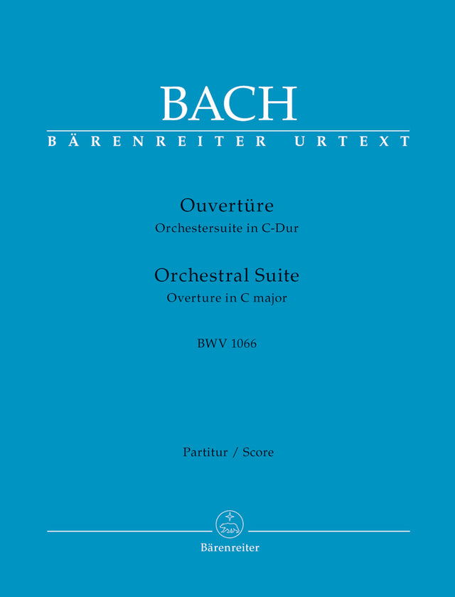 At that time Bärenreiter also issued separate scores and parts which however were prepared with additional articulation and performance suggestions. Bärenreiter's new edition of Bach's great four suites now presents the Urtext as found in the " New Bach Edition" i.e. without emendations and performance suggestions. The orchestral parts have been re-engraved and the material includes an alternative version of the Overture and Air to the in D Major suite BWV 1068 including a "Violino concertato" part.