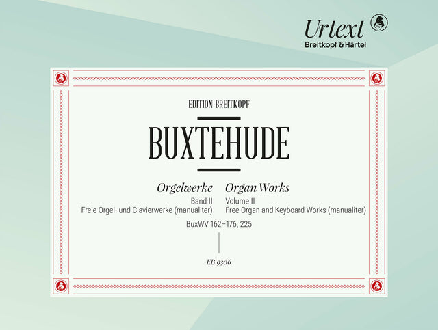 Grouping the free organ repertoire into works with obbligato pedal and works for manuals, this edition is organized in two volumes. The first subvolume (I/1, EB 9304) contains the Preface and the Preludes, whereas the second subvolume (I/2, EB 9305) contains Toccatas, Ostinato works, alternative versions and a comprehensive Critical Commentary (in German only). Volume II (EB 9306) contains Buxtehude's free organ and keyboard works (manualiter) with the corresponding texts (Preface and Critical Commentary).