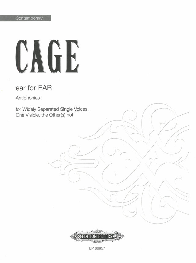 Cage wrote ear for EAR as a commission from EAR Magazine in celebration of its tenth anniversary. It is a very simple composition, consisting of one page with eleven lines of music composed in antiphonal style, a solo statement with a choral response. The subtitle (Antiphonies) refers to works in the Roman-Catholic Liturgy, in which two choirs sing in alternation. The text is wordless and uses only the letters found in the word EAR. Cage indicates that the singing should be without vibrato and in one breath, and that the dynamics should be p-pp. As he recounted in an interview printed in Audio Arts Magazine - Volume 6, 1983), "I called it Ear for EAR thinking of the omission in the Bible of 'ear for ear'. They say 'tooth for tooth' and 'an eye for an eye', but they didn't say anything about an ear."