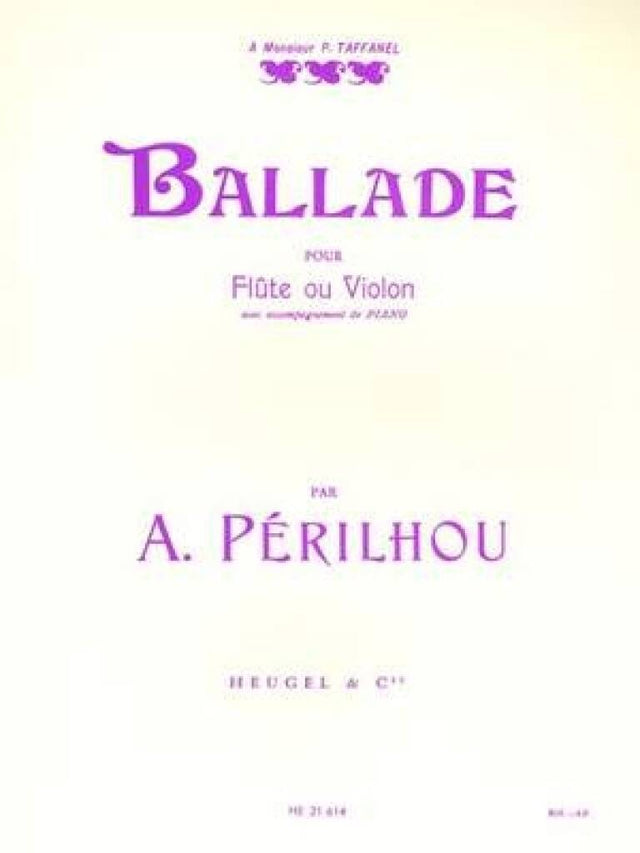 "Written for Flute or Violin accompanied by a Piano, Ballad is a piece by Albert Périlhou (1846-1936), dedicated to Paul Taffanel. This piece is one of the most famous by this author and could be chosen as a contest or a recital work. Composed in 1903, Ballad is a one-movement piece which begins with a slow part and alternates with an Allegro section. This latter is the section of the main theme which demonstrates the range of the flute with expressive runs. The melody of the slow part keeps coming back along the piece, which finishes on it. The difficulty of this piece would suit upper-intermediate level players."