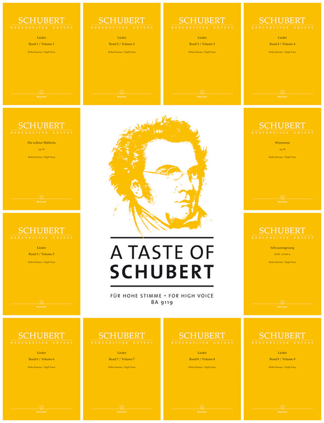 Do you know Bärenreiter's performing edition of Schubert Lieder? 13 volumes containing the complete Lieder for solo voice and piano in editions for high, medium and low voice are planned. "A Taste of Schubert" presents one to three pieces from each volume to create a cross-section of Schubert's complete lieder œuvre. Lieder from his famous cycles are included as well as "Sehnsucht", of which he wrote several settings. Contrasting genres have also been taken into consideration, beginning with simple strophic songs, via the ballad "Der König von Thule" through to his long Ossian Lied "Cronnan".