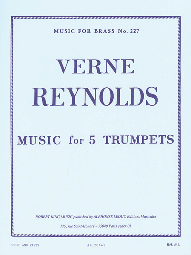 American born Verne Reynolds (1926-2011) was a Horn player, composer and teacher. His Music for 5 Trumpets makes for an exciting addition to the Trumpet's ensemble repertoire. Music for 5 Trumpets comprises three movements; 1) Fanfare, 2) Chorale, and 3) Finale. The work makes use of a variety of musical characteristics, including variations in articulation, time signatures, accidentals, chromaticism, tempo, rhythm and dynamics, among other aspects. for all trumpeters seeking to expand their ensemble repertoire, Reynold's Music for 5 Trumpets provides an excellent performance work.