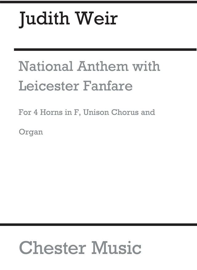 Judith Weir's National Anthem with Leicester Fanfare is a work commissioned by Leicester Cathedral and first performed there at the Service of Reinterment of the Remains of King Richard III on 26th March 2015. Scored for 4 Horns in F, Unison Chorus and Organ Accompaniment, a full performance lasts around 2 minutes. This is the Full Score.
