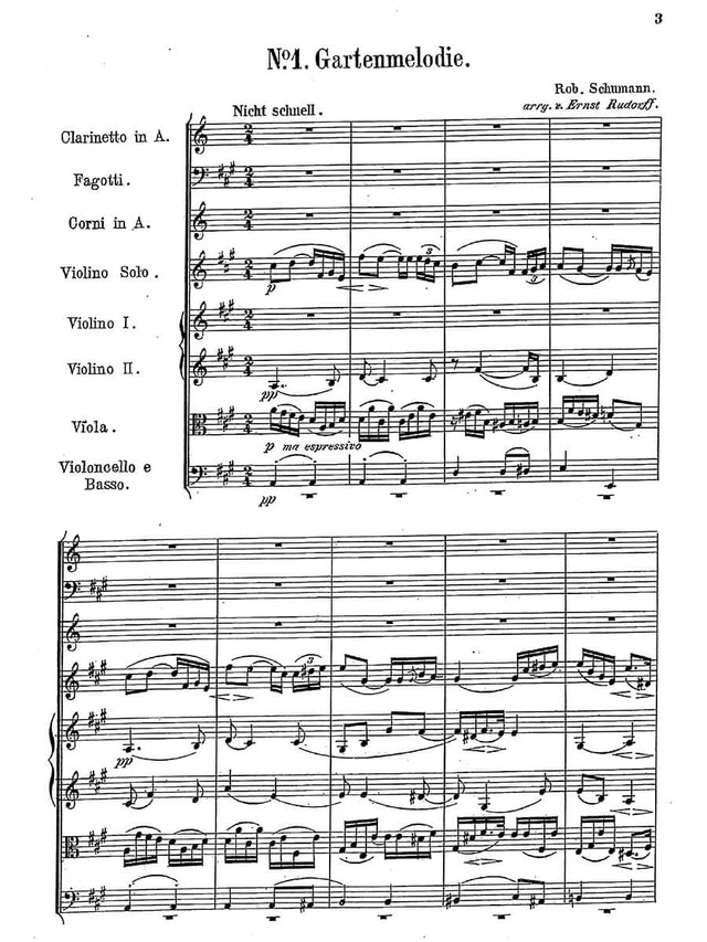 Garden Melody and At the Fountain, Two Pieces from Op. 85 For violin and orchestra, arranged and orchestrated by Johann Kruse and Ernst Rudorff Berlin: Bote & G. Bock, plate 13117. Orchestration (Gartenmelodie): solo violin with 2 clarinets (A), 2 bassoons, 2 horns (A), strings Orchestration (Am Springbrunnen): solo violin with 2 flutes, 2 oboes, 2 clarinets (B-flat), 2 bassoons, 2 horns, 2 trumpets (D), 2 timpani (D, A), strings