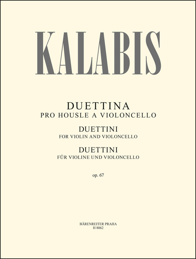 Chamber music holds a significant place within the extensive oeuvre of Viktor Kalabis (1923–2006), one of the most significant Czech composers of the 20th century. This includes the "Duettini for Violin and Cello", Op. 67 from 1987. Kalabis wrote this work for violinist Jana Vlachová and cellist Mikael Ericsson, who premiered it in Domažlice in 1991. The "Duettini" consist of four expressively contrasting movements and have remained unpublished until now; the first edition is based on the autograph, which is kept in the Viktor Kalabis and Zuzana Ružicková Endowment Fund.
