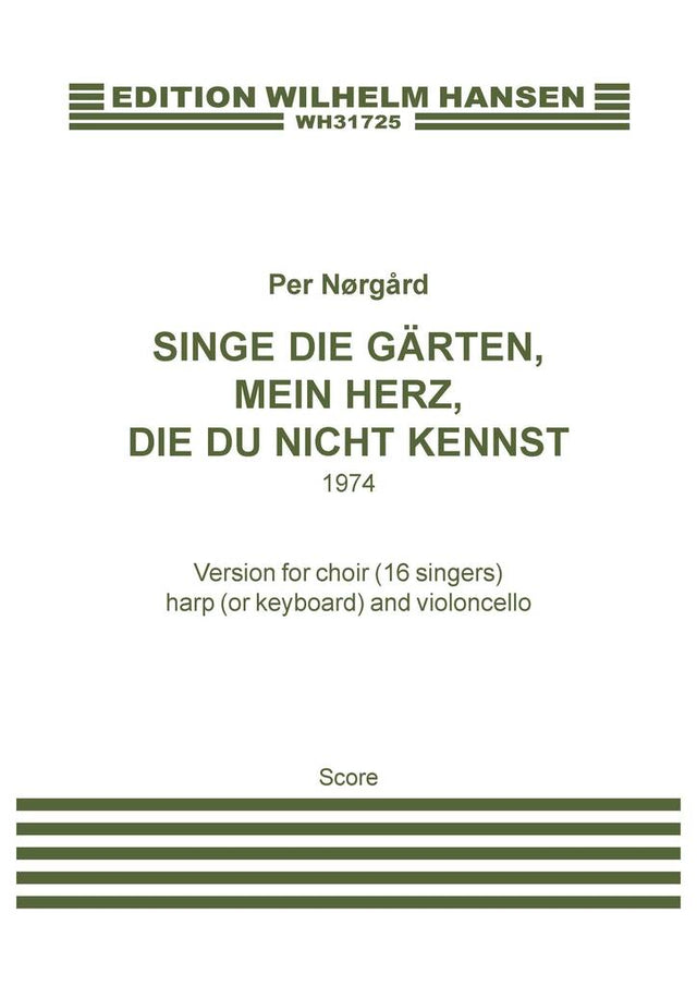 Singe Die Gärten, Mein Herz, Die Du Nicht Kennst was composed by Per Nørgård in 1974. This version is scored for Choir (minimum 12 singers), Harp and Cello. Edited by Ivan Hansen in 1997.