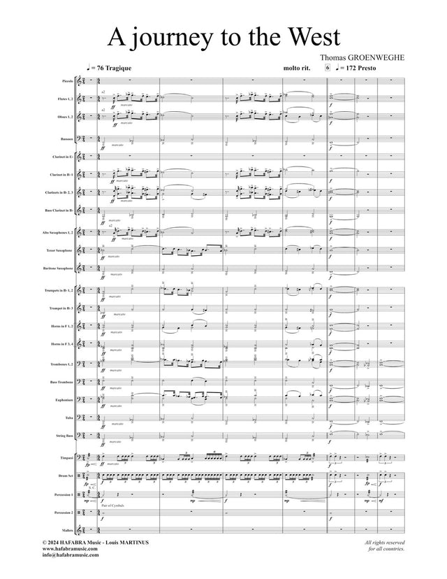 Inspired by the many Wild West soundtracks and feature films, mainly cartoons and animated films, the composer tells his own story in music. The piece A Journey to the West tells of the bravery, courage, but also the innocence of a hero in spite of himself. After a baroque and majestic opening imposing on us the atmosphere of this typical American setting, a rapid gallop of bass and percussion brings us the theme of our hero. Lively, light, carefree, it makes the horns and saxophones roar, then taken up by the woodwinds and trumpets. If the melody is light, the atmosphere quickly becomes heavier, a shadow flies over the city! Beware!