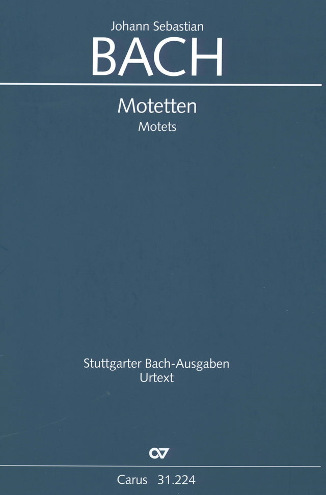 Carus offers the motets of Johann Sebastian Bach in two editions. The edition with realized figured bass also includes an English translation. in addition to BWV 225-229, both volumes contain "Lobe den Herr, all Heiden" (BWV 230) and "Ich lasse dich nicht" (BWV Anh. 159). However, "Jauchzet dem Herrn, alle Welt" (BWV Anh. 160), the large pasticcio drawn from movements of cantatas by Teleman and Bach is contained only in the edition with figured bass.