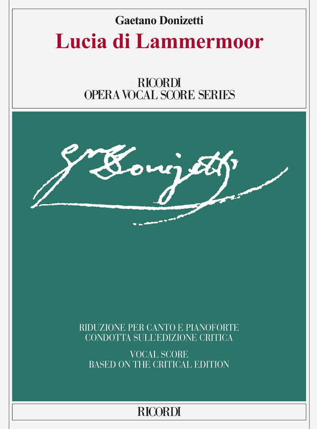 Gaetano Donizetti's Lucia di Lammermoor , written to a libretto by Salvadore Cammarano, was first performed at the Teatro di San Carlo in Naples on September 26th, 1835. It has remained in the repertory without interruption as one of Donizetti's most popular operas throughout its nearly 200-year history. The edition proposes as the principal text a version of the opera that, for the most part, is as near as possible to that given at the premiere in Naples. The critical edition restores the original keys, thus maintaining Donizetti's overall harmonic design, but discusses transpositions that later entered the performing and editorial tradition of the opera. What is presented here is the reduction for voice and piano.