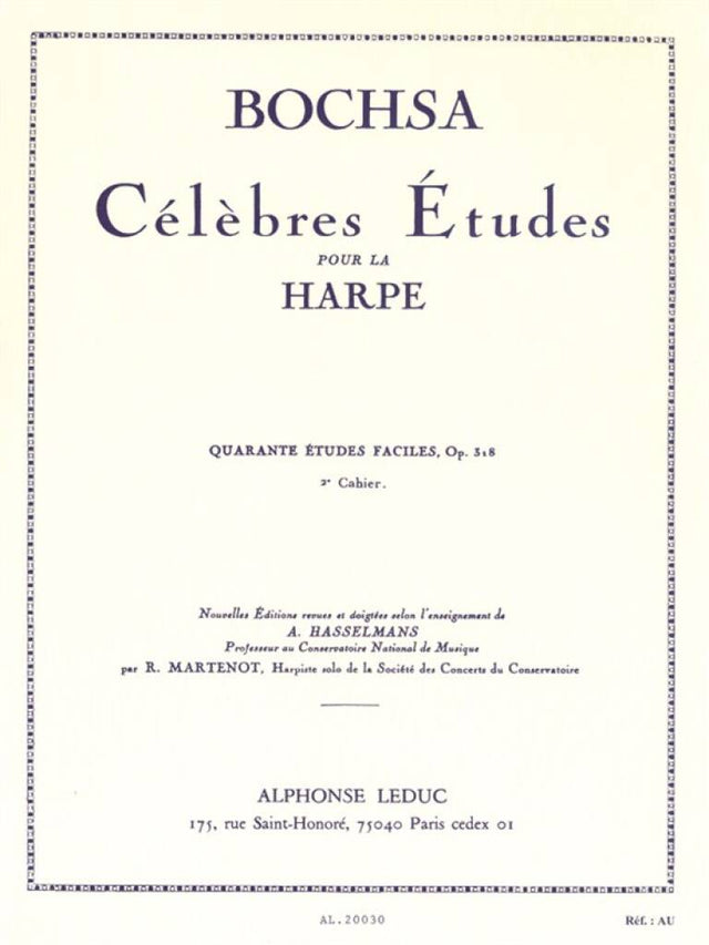 Australian born, Nicolas-Charles Bochsa (1789-1856) studied at the Paris Conservatoire before embarking upon a career as a harpist and composer. His Celebrated Studies for Harp, 40 Easy Studies is well-informed and essential to progression on the instrument. The second volume comprises 40 easy exercises which focus on fingering, countermelodies, rhythms, intervals, chords, articulation, phrasing, chromaticism, dynamics and performance directions, among other musical aspects. Celebrated Studies for Harp by Nicolas-Charles Bochsa is essential to accompany all harp studies.