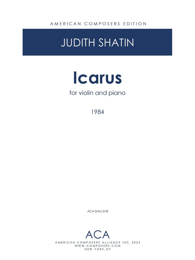 Composer's Note: The myth of Icarus seems an apt metaphor for the creative process: the attempt to transcend, and the riskiness of the endeavor. The story of the escape of Daedalus, noted for his wonderful sculptures, together with his son Icarus is a compelling one. Imprisoned by King Minos in the labyrinth that Daedalus had designed, and the Minotaur later inhabited, Daedalus searched for a means of escape. He fashioned wings made of bird feathers and wax, and he and Icarus flew away, soaring over the Aegean Sea. But, according to the story, Icarus, heedless of his father's warnings, flew too near the sun, the wax melted and he plunged to a watery grave. This myth has inspired many artists: Bruegel in his Landscape with the Fall of Icarus; Matisse, in The Flight of Icarus; Auden's Icarus; William Carlos Williams's Landscape with the Fall of Icarus; Anne Sexton's To a Friend Whose Work Has Come to Triumph; Nino Rota's piano concerto, also named Icarus. There are numerous examples, each with its own twist. My Icarus, composed for violinist Kevin Lawrence in 1983, is cast in four movements. Each was inspired by a different aspect of the story. The first, marked Majestic, is assertive, and confident, with an extended violin cadenza that soars, expressing the will to break barriers, as well as the innocence of one who has not yet had to do so. The second suggests the complex relationships between father and son, now in agreement, now in heated debate. The third hovers in the registral stratosphere, conveying the floating quality of flight, as well as its inevitable turbulence. The last movement shivers with the violence of effort and the catharsis of the plunge. Icarus was recorded by violinist Hasse Borup and pianist Mary Kathleen Ernst on Tower of the Eight Winds, a CD of Shatin's violin/piano music on Innova.