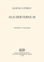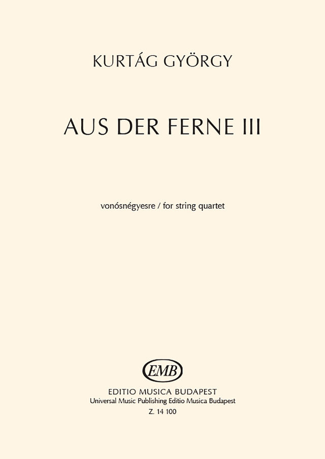 Aus der Ferne III is a short piece written in 1991 for the 90th birthday of Alfred Schlee, the emblematic director of the Viennese publishing house Universal Edition. The cycle of five pieces Aus der Ferne thus unfolds over more than fifteen years: Aus der Ferne No. 1 and 2 for piano were written for Schlee's 80th and 85th birthdays (Játékok V), piece No. 4 for his 95th birthday (Játékok VII), while that the 5th and last piece is indicated in memoriam (for sttring quartet, unpublished). "From the distance" come the tenuous sounds of the violins and the viola; the cello should sound like a kettledrum. The title, a fairly common musical indication in romantic music ("wie aus der Ferne": "like from afar"), could also come from the beginning of this poem by Hölderlin: Wenn aus der Ferne, da wir geschieden sind, / Ich dir noch kennbar bin, die Vergangenheit / O du Teilhaber meiner Leiden! (If from afar, as we are divorced, / I am still recognizable to you, the past, / O you who share my sufferings!) (Grégoire Tosser)