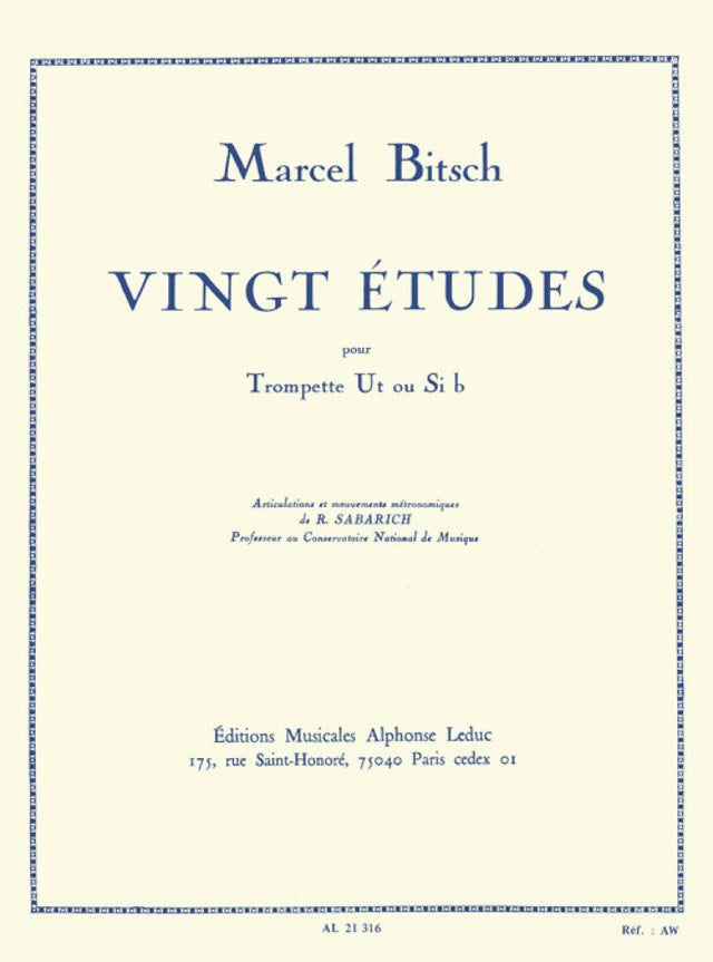 Born in Toulouse, Marcel Bitsch went on to study at the Paris Conservatoire before becoming a professor of counterpoint at the institution. As an exceptionally versitile composer, Bitsch has composed orchestral works, chamber works and numerous pieces and studies for wind instruments. 20 Études comprises unique studies covering all technical aspects asked of trumpet players. Suited to advanced level trumpeters, Bitsch's Vingt Études for Trumpet can be played on both the C and B-flat Trumpet. From articulation and complex rhythms to range and dynamics, the variety of musical elements included in this Marcel Bitsch study book is outstanding, creating a necessary addition to the trumpet player's progression.