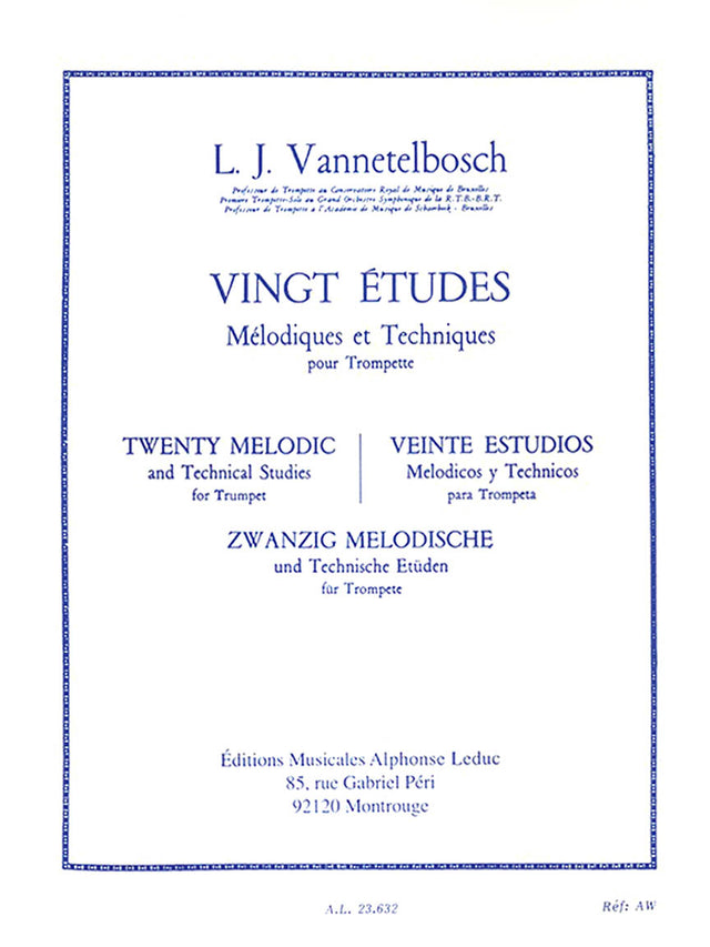Belgian born, Louis Julien Vannetelbosch (1920-2000) was an established composer, conductor and trumpet player. This diverse expertise led him to publish 25 successful studies for trumpet, the Majority of which have been compiled in Twenty Melodic and Technical Studies. Vannetelbosch studied at the Leuven and Brussels Conservatoires where he won many prizes. His professional career gained him success with many orchestras and he later went on to conduct and judge competitions. Vannetelbosch's Twenty Melodic and Technical Studies for Trumpet are in a variety of styles, and address aspects including rhythm, time signatures, breath control, tonality, tempo, range, dynamics, articulation, phrasing, and ornamentation, among many other musical elements. for all advanced trumpeters, Twenty Melodic and Technical Studies is essential to aid progression to a high technical standard.