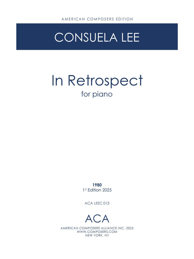Consuela Lee's In Retrospect is a small 1980 piano work. It is distinct in its use of Ms. Lee's tendency for rising fifth patterns that envelop the melody and motifs as they drift through various keys.