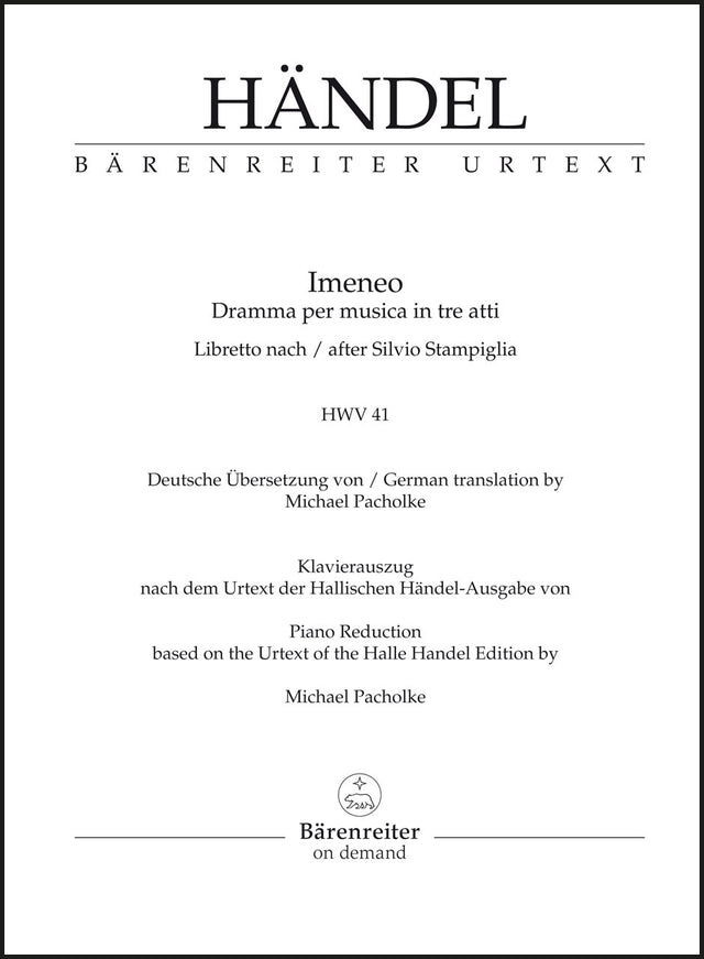 Imeneo was premièred at Lincoln 's Inn Field in London on 22 November 1740 and given a second performance on 13 December of the same year. Unlike the varied events and convoluted action otherwise typical of opera seria , it has an uncomplicated plot line with a clear dramatic structure and excellent music. The arranger of the libretto is unknown. Handel wrote this opera for his final season in London , but he also revived it in Dublin on 24 and 31 March 1742 as a " serenata ". for this revival, presumably a concert performance, he altered the 1740 score. The alterations are listed in the appendix to the vocal score. Our vocal score is based on the Urtext of the full score published in the Halle Handel Edition. Easy-to-play piano reduction designed for performers Vocal parts with the Urtext from the Halle Handel Edition