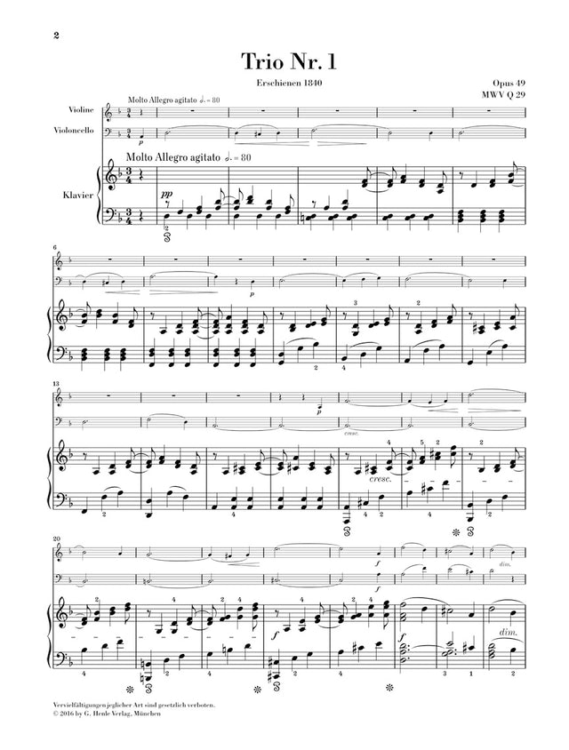 After an early work and a discontinued attempt in 1831-32, Mendelssohn made his breakthrough in this important chamber music genre in the summer of 1839 with the Piano Trio in D Minor, Op. 49, which was to be followed six years later by the Trio in C Minor, Op. 66. On publication of the first trio, Schumann took the opportunity to describe the composer as the "Mozart of the 19th century", whereby he was obviously alluding to the mixture of Classical and Romantic stylistic elements. The musical text of these two famous trios has been thoroughly revised to reflect the latest scholarly findings.