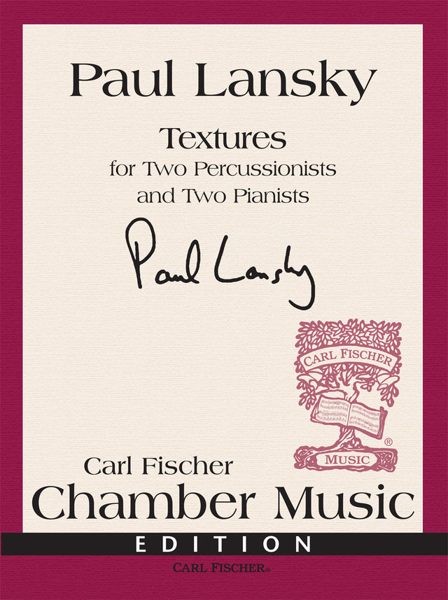 Textures, for two percussionists and two pianists, utilizes the wide breadth of sounds percussion instruments are able to create. Lansky instructs the players to find metals that have different decays, skins that are not too "boomy" or with a "twang", wood blocks, and keyboard instruments - creating a world of sound. Written in eight short pieces, this work is for advanced performers.
