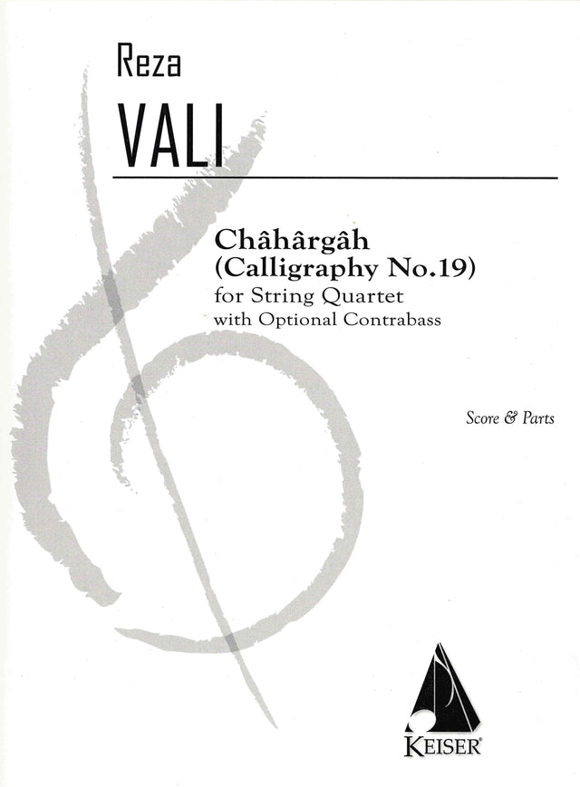 Châhârgâh (Calligraphy No. 19) for string quartet with optional contrabass may be performed using the Persian Traditional Tuning System. A detailed chart to set the interval measurements is included with the music. Châhârgâh (Calligraphy No. 19) is part of Reza Vali's "Calligraphies" series, an ongoing cycle of works based on the Persian modal system, the "Dastgâh", which he has been composing since 2000. Versions for string quartet and 10 solo string instruments are available from the publisher.