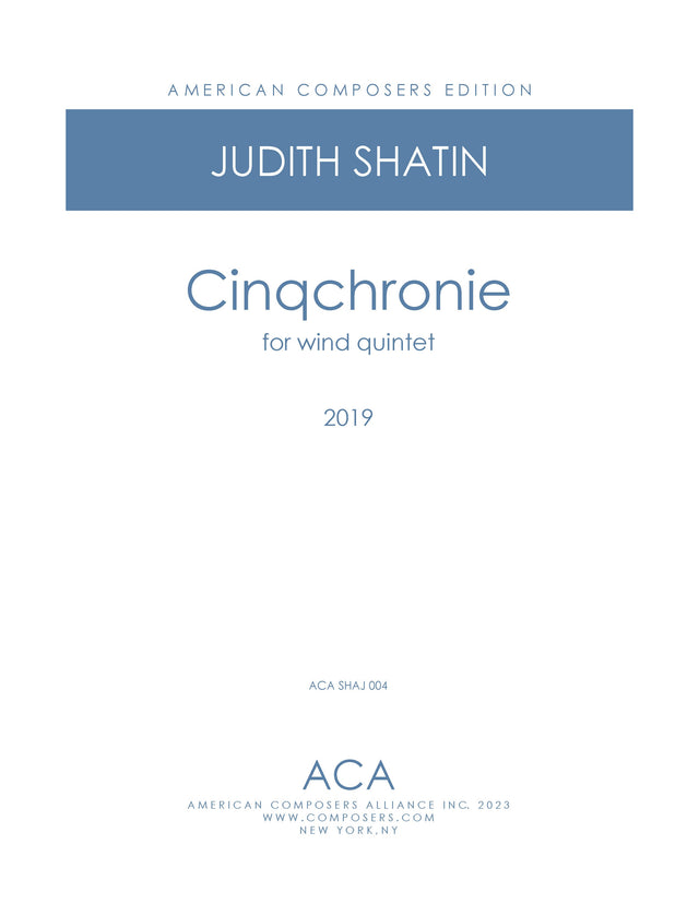Cinqchronie celebrates both the individuality and collaboration of the members of the wind quintet. The title, with its play on both "synchrony" and "chronos," as well as the French "cinq,' meaning five, refers to the plethora of interactions of the five members. The piece opens with each instrument handing a single pitch to another, showcasing their individual voices. Gradually, all the musical elements combine to shine a sonic light on both their individual timbres and their blending. One of the characteristics of their interactions is the phenomenon of streaming, creating syncopated rhythms among the parts.