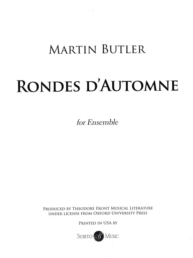 In a number of ways Rondes d'Automne can be seen as another piece which attempts to assimilate and explore aspects of folk music - the rhythms, playing styles, textures and modal harmonies of American folk music in particular; although as in all other works of this type no actual folk melodies are quoted or referred to. The title is intended to group Rondes d'Automne with two other works of this type (both written for the Schubert Ensemble, American Rounds and Spring Rounds); 'rounds' implying canonic, playful approaches to the music's material and the use of French both allying the piece with Debussy's wonderful Rondes de Printemps and helping (in my mind) enhance the slightly melancholy, subdued colours of the work's 'autumnal' atmosphere overall.