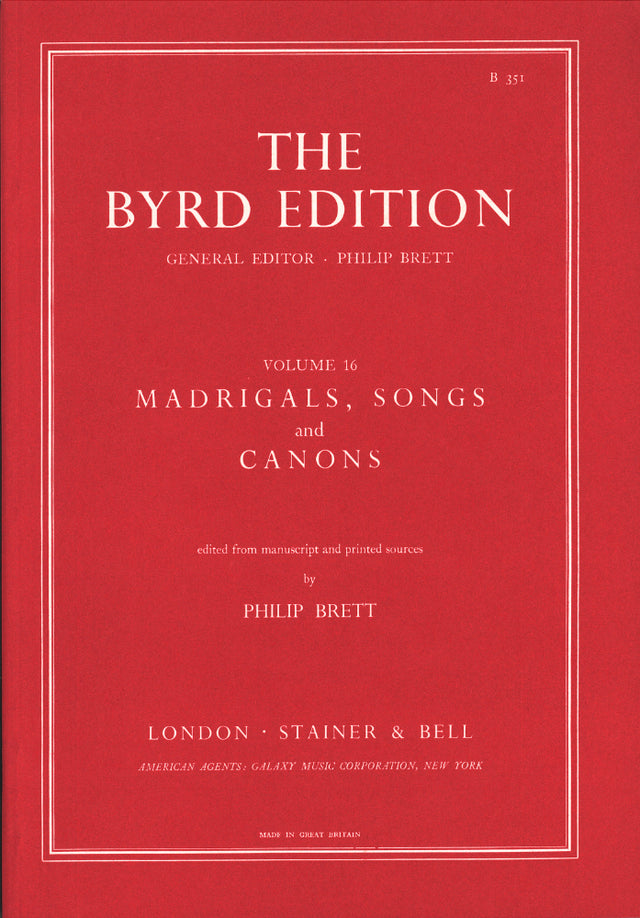 Of madrigals and partsongs - Volume 16 of the Byrd Edition contains the six items not included in the printed sets of 1588, 1589 and 1611 (distinguished by the lack of obligatory instrumental accompaniments); of the consort songs, the original versions of consort songs that were subsequently arranged as madrigals; and of canons and rounds, the two that can without doubt be attributed to the composer.